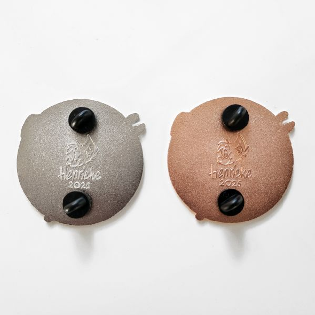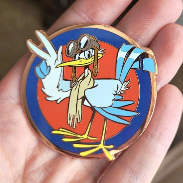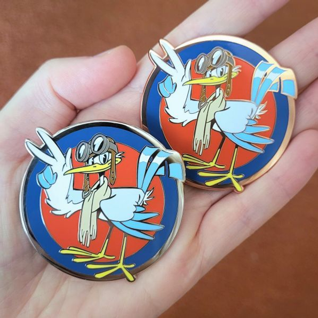 Ca. 5cm (2 inch) wide hard enamel pin of Jack the aviator bird. Nickel plated in rose gold.